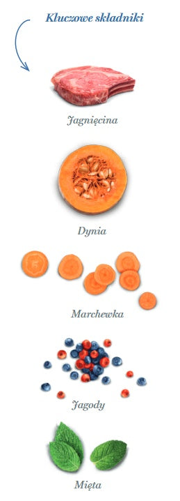 Świeżo przygotowana jagnięcina 66% (używamy 125 kg świeżo przygotowanej jagnięciny do wyprodukowania 100 kg naszego produktu), cały zielony groszek, białko grochu, olej z kurczaka (chroniony naturalnymi tokoferolami), mączka chleba świętojańskiego, błonnik jabłkowy, hydrolizat wątroby jagnięcej, drożdże (Saccharomyces cerevisiae), minerały, tapioka, odwodniony ziemniak, nasiona lnu (naturalne źródło kwasów tłuszczowych omega 3), olej rybny (chroniony naturalnymi tokoferolami), psyllium, odwodniony jarmuż, kryl antarktyczny, wodorosty kelp, spirulina, odwodniona dynia 1,000 mg/kg, odwodniona marchew 1,000 mg/kg, jagody 1,000 mg/kg, żurawina 1000 mg/kg, cykoria (źródło FOS) 1,000 mg/kg, hydrolizowana ściana komórkowa drożdży (źródło MOS) 1,000 mg/kg, ekstrakt z mandarynki, imbir, mięta 500 mg/kg, yucca schidigera, rozmaryn.