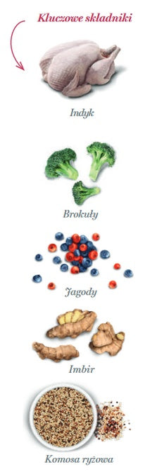 - Smak i źródło białka: indyk (monobiałkowa formuła)
