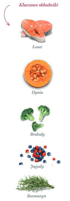 - Główne białko zwierzęce: łosoś (monobiałkowa formuła – jedno źródło białka)