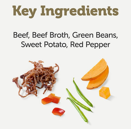 Bulion wołowy, mięso wołowe (35%), zielony groszek (10%), batat (10%), czerwona papryka (5%).