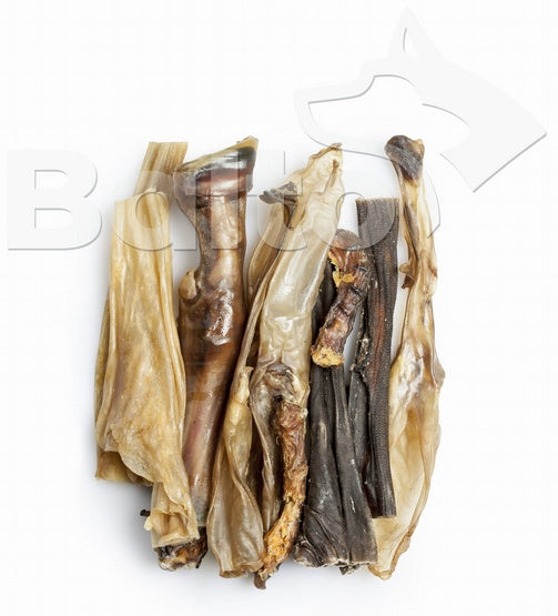 - Zawartość (przykładowo, może się różnić): szyjki gęsie lub kacze; racica barania lub sarny; skóra barania lub królicza; ucho królicze lub baranie