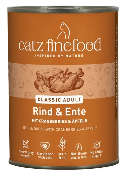 Specjał dla kotów – wartościowa karma dla naszych pupili. Catz finefood N°23 zawiera dużo delikatnej wołowiny, kaczkę oraz wartościowe dodatki, jak żurawina i aloes. Bez konserwantów, barwników i wzmacniaczy smaku. Nie zawiera GMO. Mmmmiau!