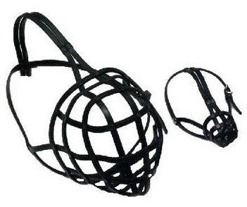 Solidny i wytrzymały kaganiec wykonany ze skóry naturalnej, łączonej stalowymi nitami.