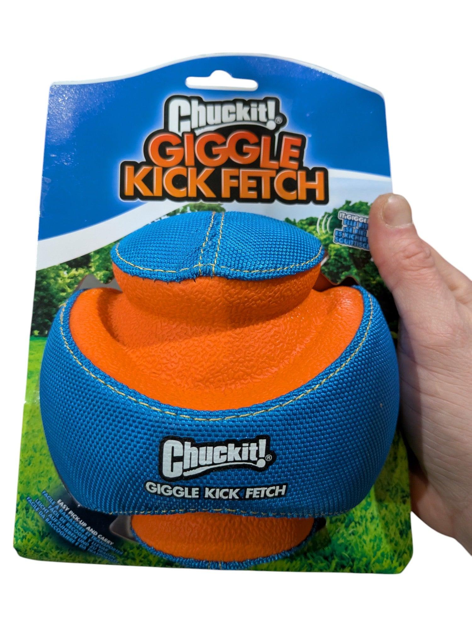 De Chuckit Giggle Kick Fetch is een unieke bal die een grappig "giggle"-geluid maakt wanneer hij rolt. Dit maakt het speeltje extra aantrekkelijk voor nieuwsgierige honden en ideaal voor honden met verminderd zicht. De speciale vorm zorgt ervoor dat honden de bal gemakkelijk kunnen oppakken en dragen. Gemaakt van een combinatie van stevig rubber en canvas, is deze bal ontworpen voor langdurig speelplezier en apporteren.