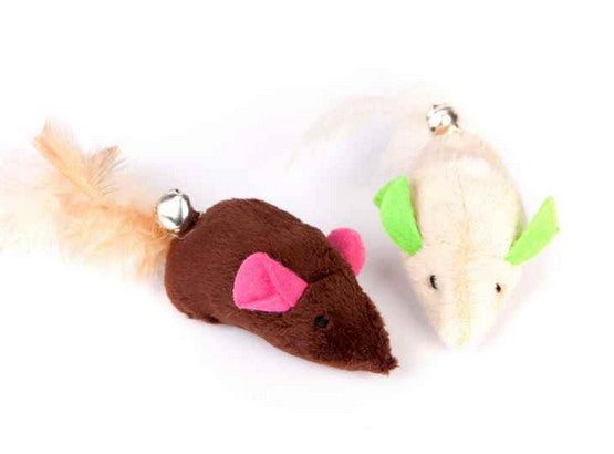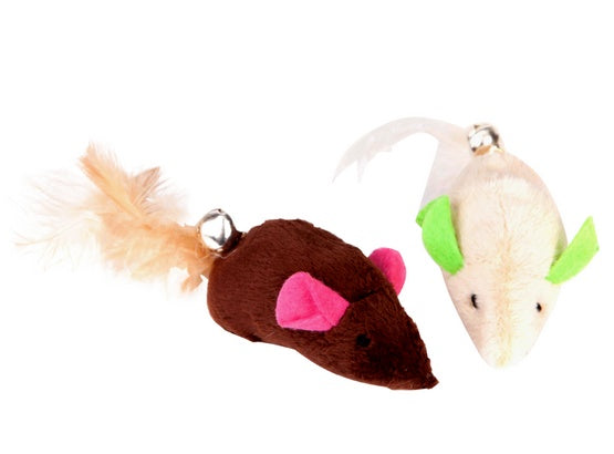Zabawka dla kota myszki z piórkami - wykonane z pluszowego, kolorowego materiału.