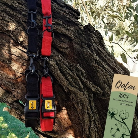 Obroża dla psa wykonana z bawełny o ciekawym splocie. Posiada bardzo ładne czarne okucia, które dodają charakteru i wyjątkowego wyglądu. Zapinana na plastikową, wytrzymałą klamrę klik-klak, ozdobioną logo Dingo. Wszystkie te elementy powodują, że obroża prezentuje się bardzo ładnie.