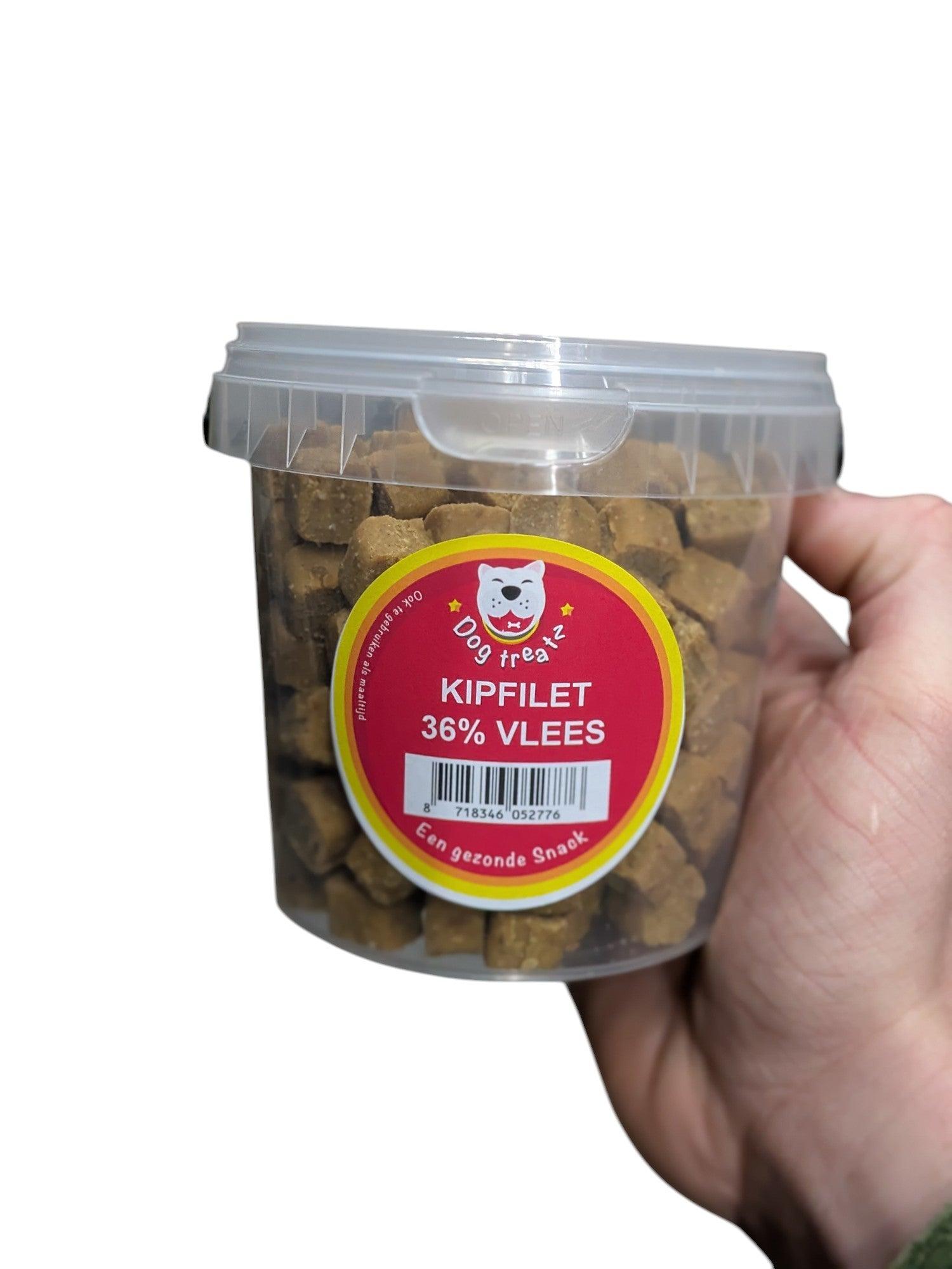 Samenstelling: 36% kipfillet-gevogelte, 30% verhitte tarwebloem, 20% mais, 12% aardappel, 2% glycerine