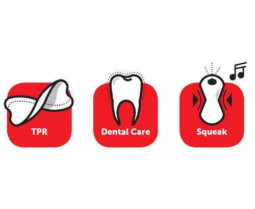 • Zabawki posiadają wypustki, które masują dziąsła psa i zapobiegają osadzaniu się kamienia nazębnego.