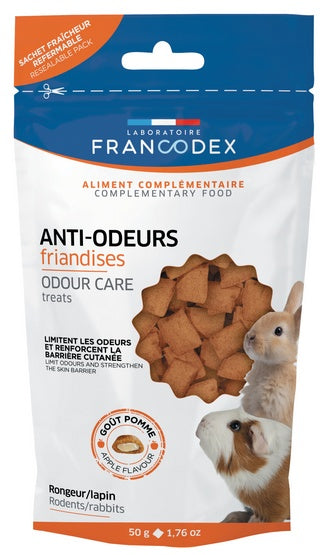 Nieprzyjemny zapach w okolicy klatki lub zagrody potrafi pojawić się nawet wtedy, gdy regularnie sprzątasz. U gryzoni i królików źródłem zapachu bywa nie tylko mocz, ale też procesy trawienne oraz specyfika sierści i skóry (zwłaszcza w okresie linienia). Francodex przysmak dla gryzoni i królików na ograniczenie zapachów to karma uzupełniająca w formie smacznych przekąsek o chrupiącej skórce i miękkim wnętrzu, stworzona po to, aby wspierać zmniejszenie nieprzyjemnych woni pochodzących z moczu, trawienia i sierści.