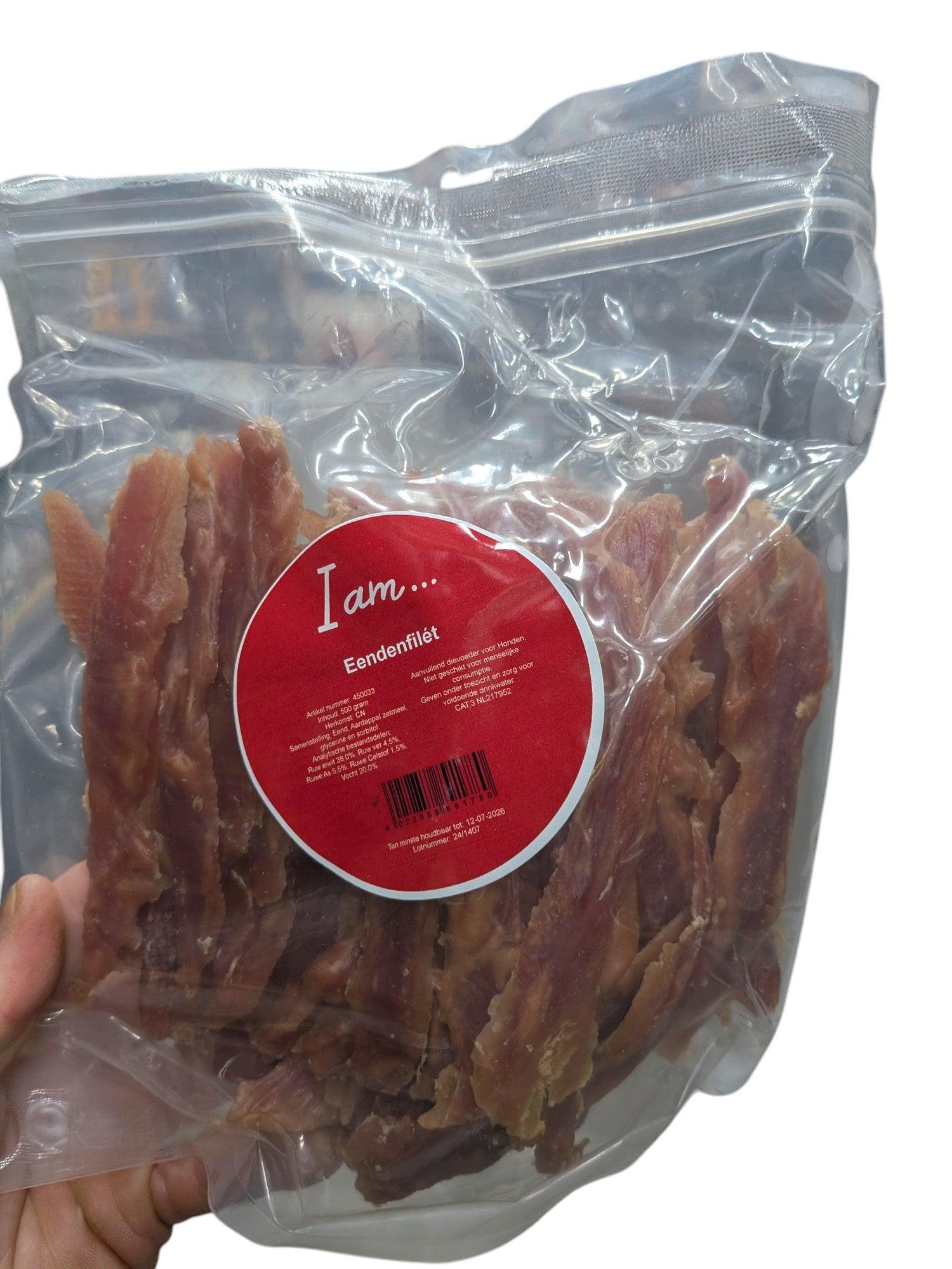 De I Am Duck Fillet 500 gr is een hondensnack van eend. Een heerlijke snack van gemaakt van gedroogde eenden filet. De strips zijn heerlijk als beloning of tussendoortje voor jouw hond.