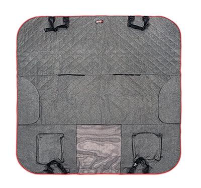 Een slimme toevoeging is het mesh venster aan de voorzijde, waardoor je hond naar voren kan kijken en contact houdt met de passagiers. Dit voorkomt stress, vooral bij onervaren of nerveuze honden. De deken is volledig waterdicht gevoerd om doorlekken te voorkomen en voorzien van twee ritsbare opbergvakken voor bijvoorbeeld snacks, riemen of poepzakjes. De openingen voor de autogordel zijn eveneens afsluitbaar met een rits. Tot slot zorgen zijflappen voor extra bescherming van de deuren.