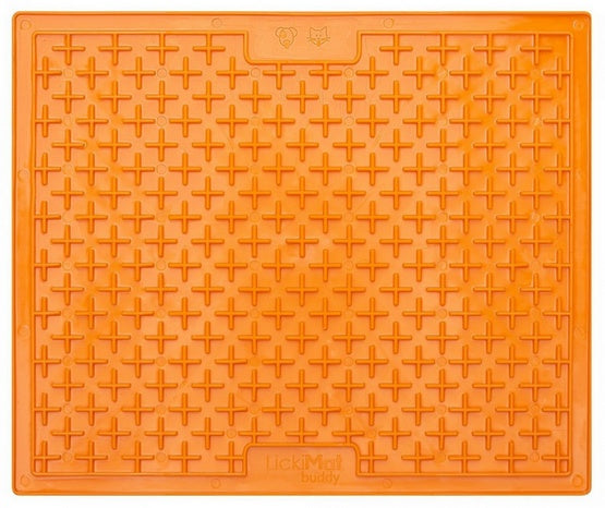 LickiMat Buddy Large w kolorze pomarańczowym to miękka mata do lizania z charakterystycznym wzorem „krzyżyka”, zaprojektowana po to, aby zamienić niewielką porcję jedzenia w dłuższą, angażującą i wyciszającą aktywność. Wystarczy rozsmarować na powierzchni maty mokrą karmę, pastę, jogurt naturalny (dla zwierząt, jeśli tolerują), mus czy rozmoczone ciasteczka, a pupil będzie „wyłuskiwał” smak językiem z zagłębień. To proste rozwiązanie, które pomaga zająć psa lub kota, ograniczyć nudę i jednocześnie wspierać codzienne rytuały: samotne zostawanie w domu, zabiegi pielęgnacyjne, odpoczynek po spacerze, czy spokojniejsze podawanie posiłków.