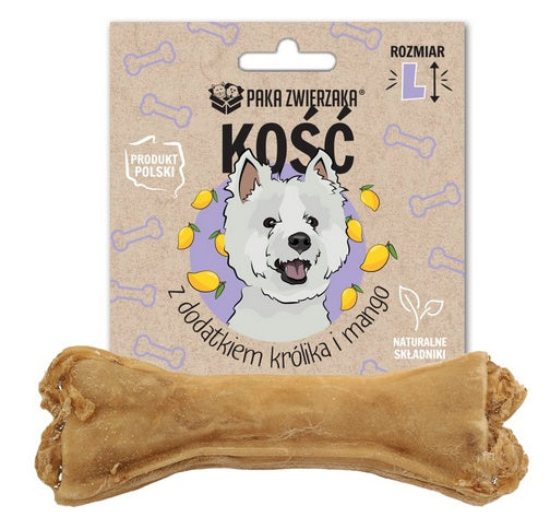 Paka Zwierzaka kość z dodatkiem królika i mango w rozmiarze L (13,5 cm) to naturalny gryzak dla psa, przygotowany ręcznie bez użycia klejów i barwników. Bazuje na suszonej skórze wołowej z dodatkiem aromatycznego królika i delikatnej nuty mango. To przysmak, który zajmuje psa na dłużej, pomaga rozładować napięcie i jednocześnie wspiera higienę jamy ustnej. Produkt jest wytwarzany w Polsce pod nadzorem Powiatowego Lekarza Weterynarii, co podnosi bezpieczeństwo i kontrolę jakości.