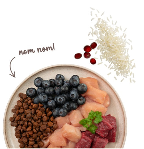 świeże mięso z kurczaka (20%), kukurydza, białko drobiowe (suszone), tłuszcz zwierzęcy, skwarki (suszone), świeża jagnięcina (4%), ryż (4%), białko kukurydziane, hydrolizat białka, suszony miąższ buraczany (bez cukru), mąka ryżowa, siemię lniane, mączka wątrobowa, olej z łososia (0,5%), węglan wapnia, chlorek potasu, borówki brusznice (suszone, 0,1%), borówki (suszone, 0,1%), pietruszka (suszona, 0,1%), drożdże (suszone, 0,1%), kwiaty nagietka (suszone, 0,05%).