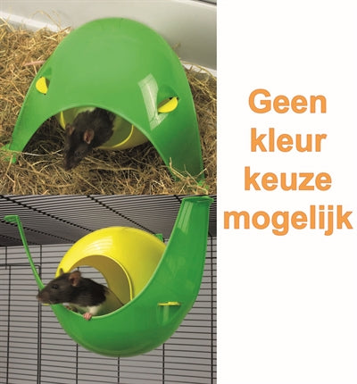 Hamsterhuisje in 'sputnik'vorm. Het huisje kan zowel op de bodem van de kooi staan als bovenin aan de tralies worden opgehangen.