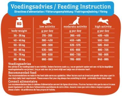 Introduceer deze voeding geleidelijk over een periode van 7 dagen om spijsverteringsproblemen te voorkomen. Zorg dat je hond altijd toegang heeft tot vers drinkwater. Bewaar het voer op een koele, droge plaats.