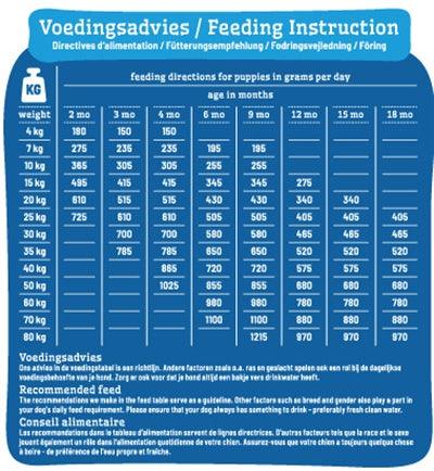 Introduceer deze voeding geleidelijk over een periode van 7 dagen om spijsverteringsproblemen te voorkomen. Zorg dat je pup altijd toegang heeft tot vers drinkwater. Bewaar het voer op een koele, droge plaats.