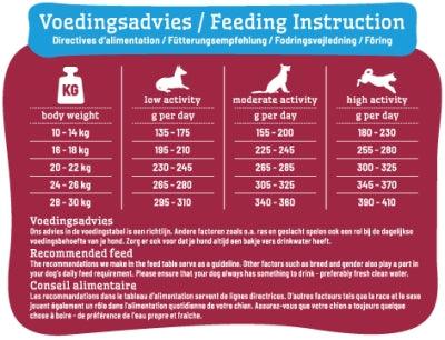 Introduceer deze voeding geleidelijk over een periode van 7 dagen om spijsverteringsproblemen te voorkomen. Zorg dat jouw hond altijd toegang heeft tot vers drinkwater. Bewaar het voer op een koele, droge plaats.