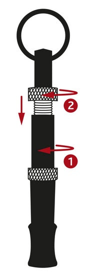 Dźwięk gwizdka można regulować. Aby ustawić ton odpowiedni dla Twojego psa, można wyregulować końcówkę gwizdka (1). Po osiągnięciu żądanego tonu, przekręć śrubę blokującą (2) do oporu na końcu gwizdka, aby ją zabezpieczyć.