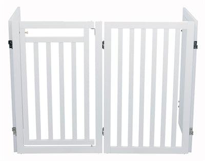 Het Trixie Hondenhek Met Deur Wit 60-160 x 81 cm is een vierdelig hek uit gelakt MDF, op verschillende manieren op te stellen, met voetjes.