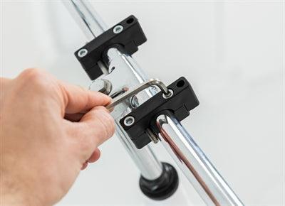 De houder wordt stevig vastgezet rond de stuurstang van je fiets. Dankzij de slimme vormgeving klemt de houder goed zonder beschadiging aan het stuur. De bevestigingshaken van de mand laat je vervolgens in de daarvoor bestemde openingen glijden, waardoor de mand veilig vastklikt en niet wiebelt of losraakt tijdens het fietsen.