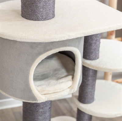 De Trixie Krabpaal Marcello Grijs 60X48X140 cm is luxe krabpaal met vijf verdiepingen en een schuilplaats. Deze krabpaal biedt jouw kat een wereld van plezier en comfort. Met vijf verdiepingen bedekt met pluche en palen omwikkeld met sisal, biedt deze krabpaal voldoende ruimte voor klimmen, krabben en ontspannen. Jouw kat kan zich heerlijk terugtrekken in de schuilplaats met een wendbaar kussen of zich nestelen in de relax-mand. De kussens zijn op de hand te wassen. Voor extra speelplezier is er een speelballetje aan een touw bevestigd. Deze krabpaal is de ideale combinatie van speelruimte en ontspanning voor jouw kat.