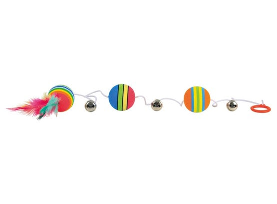 Zabawka dla kotów w postaci kolorowych piłeczek połączonych z piórkiem i dzwoneczkami.