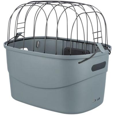 De fietsmand bestaat uit een slijtvaste kunststof bak met een stevige bovenkap van metaalgaas. Dit houdt jouw hond veilig op zijn plek, terwijl hij vrij kan kijken en genieten van de buitenlucht. Binnenin ligt een slipvaste mat die voorkomt dat je hond tijdens het fietsen wegglijdt. Daarnaast is er een bevestigingsmogelijkheid aanwezig voor een korthouder of hondenriem, zodat je jouw hond veilig vast kunt zetten.
