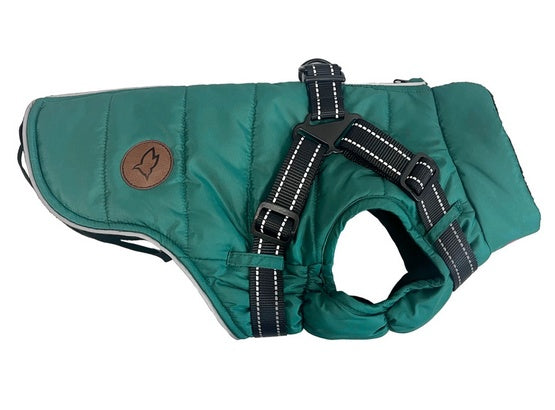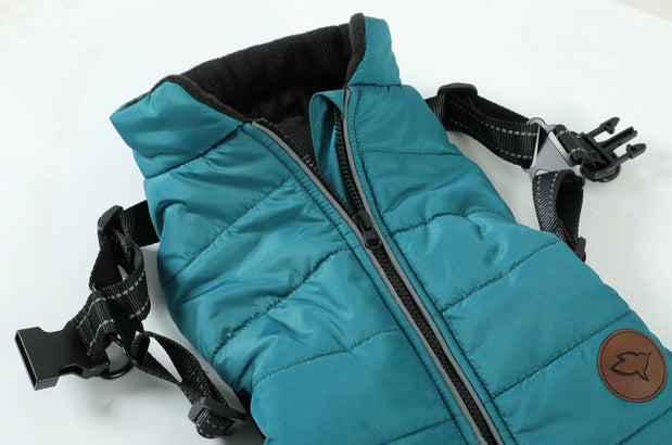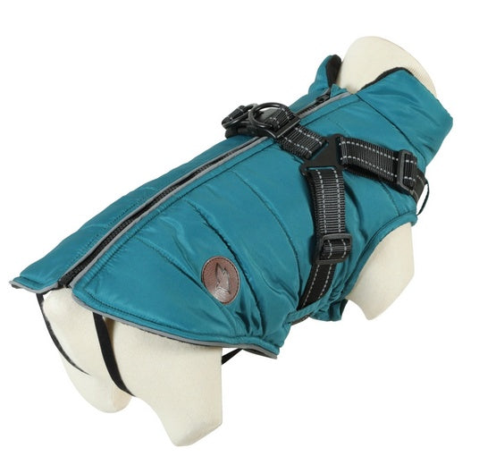 - Typ: kurtka puchowa z wbudowanymi szelkami dla psa