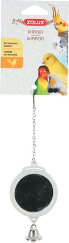 Leuk plastic spiegeltje in een ronde vorm met een belletje. Het speeltje is gemakkelijk te bevestigen aan de kooi door de ijzeren ketting met klipje aan het einde.